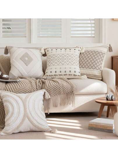 1pc/2pcs Set Gray & White Rhombus & Semi-Circle Line Pattern Throw Pillow Cover, Boho Style Tufted Fringe Cushion Cover, Nordic Decor For Home, Living Room, Office Sofa, Car, Bedroom, Outdoor Garden, 45*45cm, All Season - Diamond/Line (Beige/Gray) - View 17