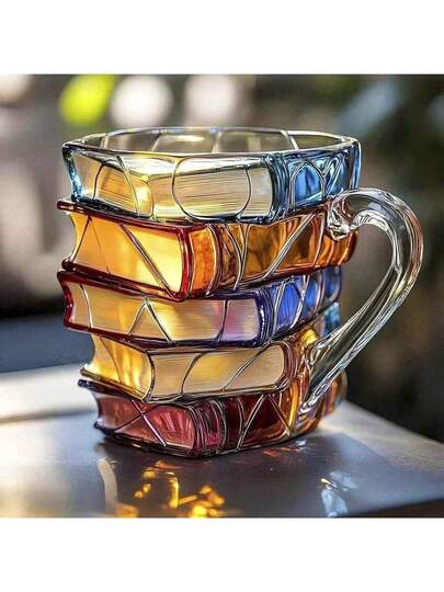 1pc 3D Book Coffee Cup, Stacked Book Glass Mug For Coffee, Tea, Milk And Hot Drinks, Artistic Literary Design Mug For Readers, Writers, And Book Lovers, Unique Creative Desk Cup For Office, Home, Study Room And Library Use, Transparent Heat-Resistant Glass Coffee Mug With Handle, Perfect Gift For Bookworms, Students, Teachers - Multicolor - View 1