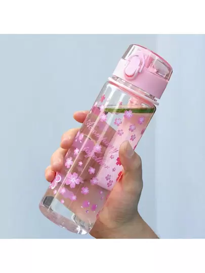 1pc 500ml pink flower pattern water bottle, simple and transparent plastic water cup - Pink - View 1