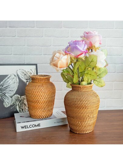 1pc 7.87 Inch Handwoven Rattan Flower Vase, Suitable For Living Room Decor - Yellow - View 1