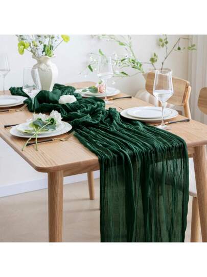 1pc 90*180/300/400cm Olive Green Bali Gauze Table Runner, Crinkle Texture Table Runner, Farmhouse Wedding Decor, Suitable For Christmas, Party, Wedding, Home Decoration, Dining Table Center Piece - Solid Color - View 13