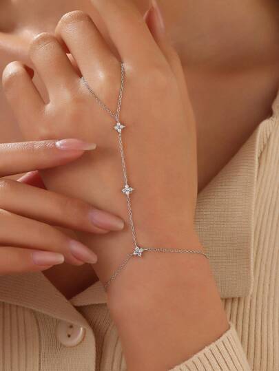 1pc 925 Sterling Silver Four-Leaf Clover Pendant With Rectangular Cubic Zirconia, Handcrafted Chain Ring Bracelet, Fashionable Accessory For Fashion Leader - Silver - View 5