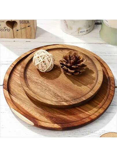 1pc Acacia Wood Round Tray, Suitable For Cheese, Appetizers And Desserts - Multifunctional Tableware, Service Tray For Bread, Pizza, Cake, Steak, Fruit, Vegetables, Snacks, Breakfast Trays, All Season - Yellow - View 10