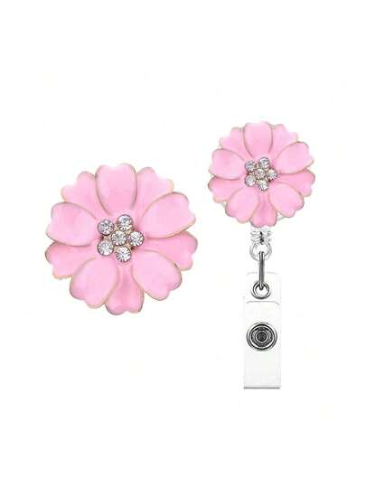 1pc Alloy Camellia Rhinestone Badge Reel, Retractable Nurse ID/Name Card Holder With Alligator Swivel Clip, Suitable For Nurses/Students, Gift - Pink - View 1