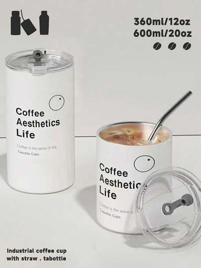 1 Pc 360ml/600ml Cold Brew Coffee Tumbler, Portable Insulated Office Mug, Double-Wall Stainless Steel Large Capacity Water Bottle With Straw - White - View 1
