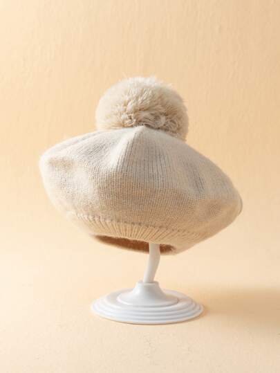 1pc Baby Solid Color Pom Pom Beret Hat For Winter Warmth - Khaki - View 1
