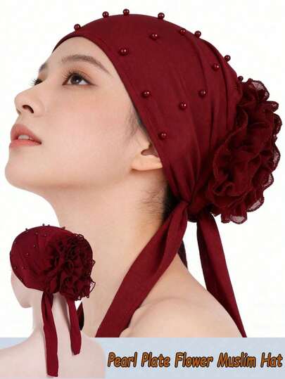 1pc Back Plate Flower Nail Bead Solid Color Large Flower Headscarf Hat, Confinement Hat, Muslim Headscarf Hat, Multiple Colors To Choose From, Women's Jacquard Headscarf Hat, A Casual Fashion Headscarf Hat, Suitable For Outdoor Travel, Gift Giving, And Home Wear - Multicolor - View 1