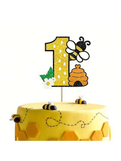 1pc Bee Birthday Cake Topper, Gold - Honeycomb & Flower Decor, Ideal For First Birthday Celebration And Teen Shower Decoration, Bee Decor, Suitable For Halloween, Christmas, Halloween And Christmas - Multicolor - View 1