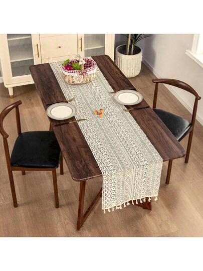 1pc Beige Hollow Tassel Decorative Tablecloth, Vintage Bohemian Geometric Embroidery, For Dining Room & Kitchen - Beige - View 1