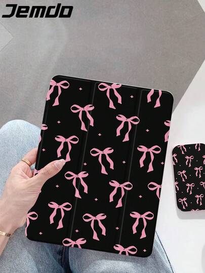 1pc Black Background, Pink Bow, Dotted Pattern Tablet Protective Case, Compatible With Apple 10.2 Inch, Apple Pro 2021/2020 9th/10th Gen, Galaxy Tab A8 10.5 Inch 2022, Matepad 10.4/Tab, Anti-Drop, With Pen Slot, Support Sleep/Wake - Multicolor - View 1
