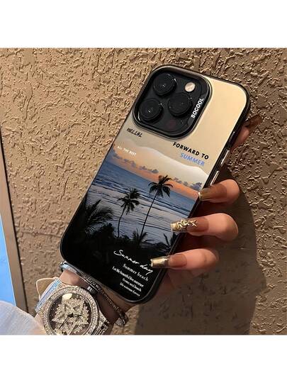 1pc Black Beach Scenery & English Sentence Pattern Mobile Phone Case, Personalized Compatible With Iphone 16 Pro Max, 15/14 Plus, 13/12/11, Suitable For Series Waterproof Shockproof Anti-Fall Scratch Resistant - Multicolor - View 1