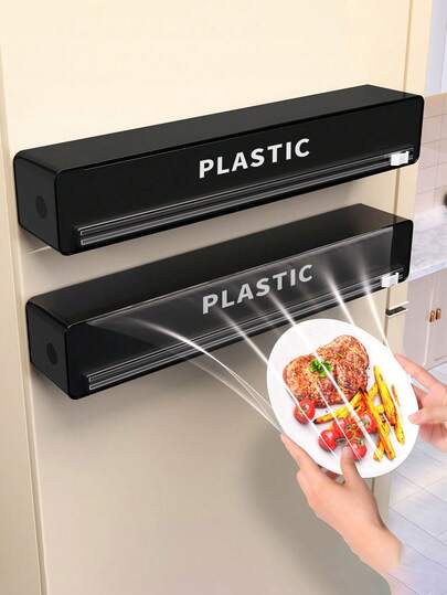 1pc Black Food Wrap Cutter, Plastic Wrap Dispenser With Sliding Blade, Magnetic Plastic Film Cutter, Kitchen Cling Film Dispenser With Strong Suction Cup, Foil Paper Cutter, Multi-Function Cling Film Dispenser With Cutter, For Food Wrap - Multicolor - View 1