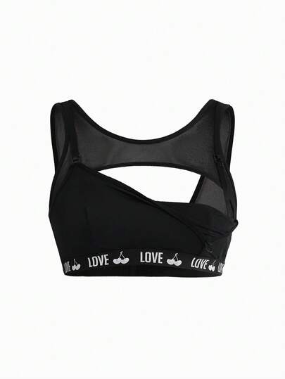 1pc Black Wide Strap Nursing Bra, Designed For Pregnant Women With Cherry LOVE Print Elastic Band And Full-Open Hook Closure Maternity Bra - Black - View 4