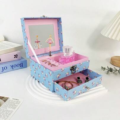 1pc Blue Small Flower Square Music Box With Lock, Paperboard Storage Box For Stationery, Toys, Suitable For Bedroom Decor, Jewelry Box, Living Room Home Decor, Great Gift For Women's Day, Mother's Day, Valentine's Day, Birthday, Wedding, Party - Multicolor - View 1