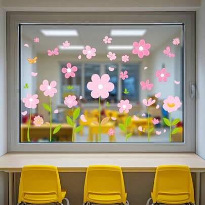 1pc Bohemian Style Pink Butterfly & Floral Watercolor Glass Sticker, Self-Adhesive Wall Decor For Home, Bedroom, Office, Kitchen - Spring & Summer Themed Art Design, Reusable Decoration, Vibrant Room Accent, Easy To Install Sticker, Butterfly Decor - Flowers and Plants - View 4