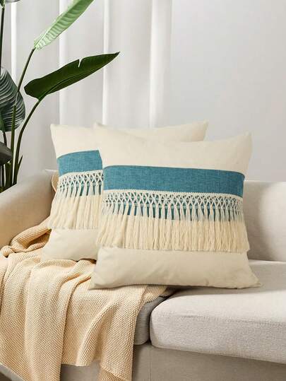 1pc Boho Tassel Throw Pillow Cover, Patchwork Canvas Living Room Cushion Cover (Pillow Insert Not Included) - Baby Blue - View 1