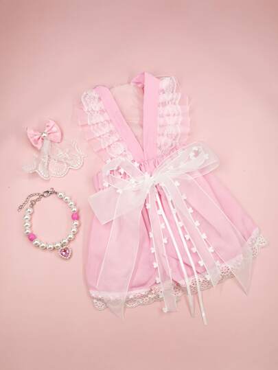 1pc Bow Decor Pet Dress & 1pc Pet Necklace & 1pc Pet Hair Clip - Multicolor - View 1
