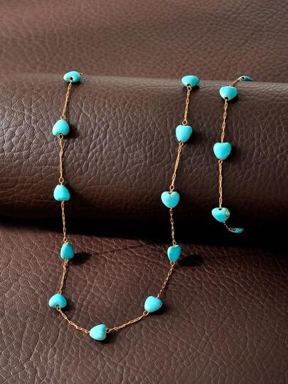 1pc Bracelet & 1pc Necklace Fashionable Bohemian Style Heart Stone Decorated Multi-Layered Chain Jewelry Set Suitable For Women's Vacation, Date, Party, Holiday Gifts And Daily Wear - Love Stone Model - View 1