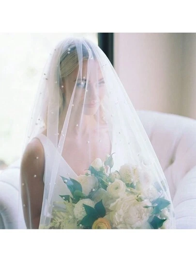 1pc Bridal Veil With Double-Layered Tulle & Faux Pearl Embellishments For Wedding Photoshoot - Beige - View 1