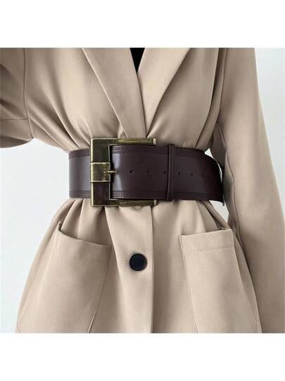 1pc Brown PU Leather Vintage Style Wide Buckle Belt For Women, Adjustable Length 103-108cm Summer, School Fall, Autumn, Halloween - Brown - View 1