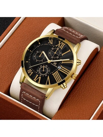 SHAARMS 1pc Brown PU Polyurethane Strap Business Date Round Dial Quartz Watch, For Daily Life - Brown - View 1