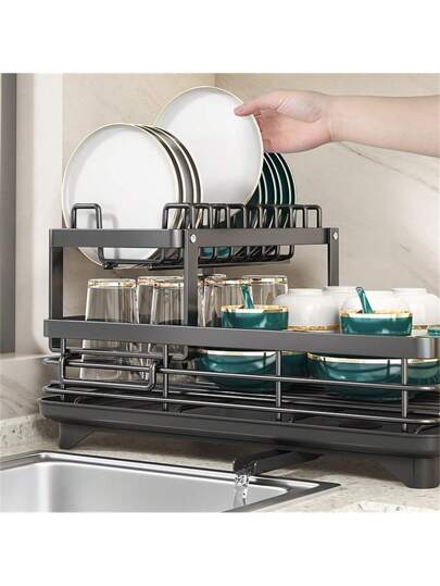 1pc Carbon Steel Kitchen Storage Rack - Bowl And Dish Rack With Drain Board, Cutlery Rack, And Chopping Board Rack, Suitable For Tabletop Storage - Black - View 1