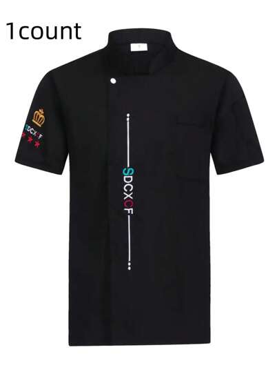 1pc Chef Uniform, Men Chef Short Sleeve Stand Collar Shirt With Pocket, Crown Print, For Cooking In Kitchen, Bakery Or Restaurant - Black - View 1
