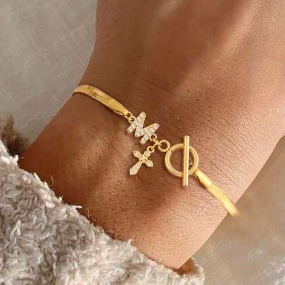 1pc Classic Fashion Initial Cross Pendant Golden Toggle Clasps Stainless Steel Herringbone Chain Bracelets For Momen - Yellow Gold - View 1