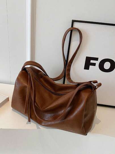 1pc Coffee Brown Simple Atmosphere Shoulder Bag Fashionable All-Match Round Cylinder Commuting Handbag For Four Seasons - Coffee Brown - View 1