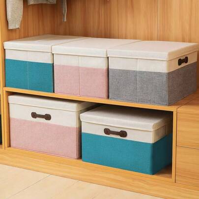 1 hộp đựng đồ cầm tay bằng vải cotton và lanh có nắp đậy, đặt trên sàn, dùng để sắp xếp quần áo, tủ gấp, tủ đựng đồ chơi, hộp đựng đồ khi di chuyển.
