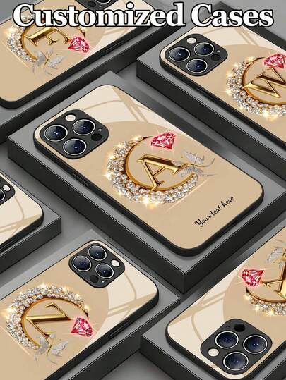 1pc Customizable Text & Letter Design Gold Crescent Moon Frame Rhinestone Studded Tempered Glass Phone Case, Compatible With Iphone 17 ProMax/17 Air/15/16 Pro/14 Plus/13 Pro/12 Pro Max/11/Xs Max/8/7/6 Plus, S24 Ultra/S25 Ultra, Redmi NOTE 13/14, Redmi K40, Mi 11, Fashionable Business Custom Gift For Family, Colleagues, Friends - Black - View 1