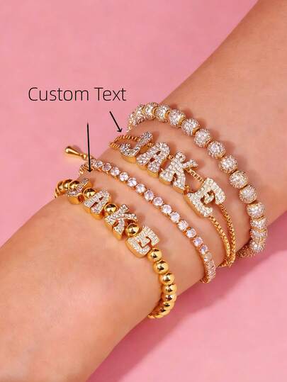 1pc Customized Jewelry Christmas Gift Bracelet, Double Layer Bubble Bead Name Letter Charm Bracelet, Fashionable, Simple, Vintage, Old Coin, Personalized, Unique Ideal Gift For Her, Boyfriend, Girlfriend, Dad, Mom, Family, Friends, Pets, Son, Daughter, Grandparents, Anniversary, Birthday, Daily Wear, Wedding, Graduation, Prom, Party - Gold - View 10