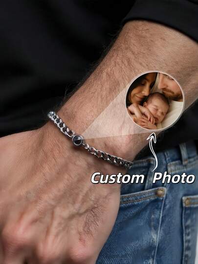 1pc Customized Photo Projection Bracelet, Personalized Stainless Steel Round Projection Bracelet, Custom Partner Photo Bracelet, Customized Thick Curb Chain Bracelet, Couples Bracelet, Memorial Photo Jewelry, Unisex Customized Valentine's Day Projection Bracelet - Projection Bracelet - View 1