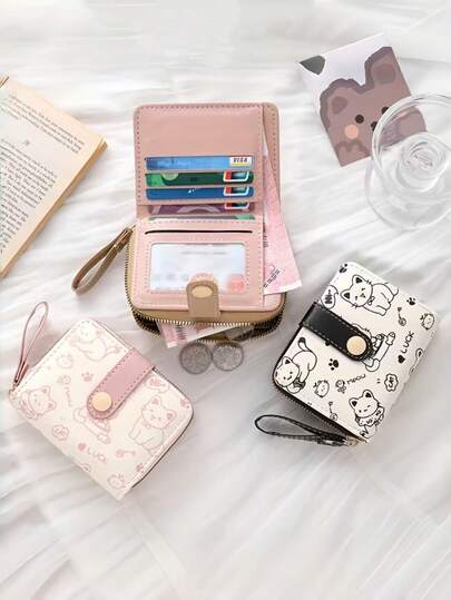 1pc Cute Bear Print Women's Wallet, Original Minimalist Japanese Style Tri-Fold Snap Closure Student Short Wallet, Women Coin Purse Clutch Bag, High-Value Compact Small Wallet, Folding Student ID Card Holder, Cute Cat Japanese Style Wallet - Pink Bear - View 1