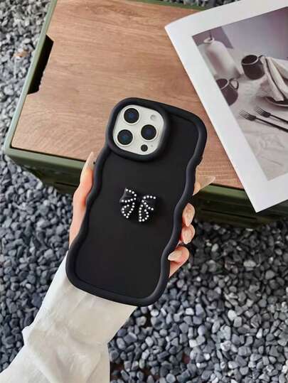 1pc DIY Rhinestone Bow Macaron Black Phone Case For Samsung Galaxy S25, S24, S24 Plus/S24+, S24 Ultra, S24 FE, S20, S21, S22, S23 And 11/11 Pro/11 Pro Max/12/12 Pro/12 Pro Max/13/13 Pro/13 Pro Max/14/14 Pro/14 Pro Max/15/15 Pro/15 Pro Max/16/16 Pro/16 Pro Max IPhone16E And OPPO A5X - Black - View 1