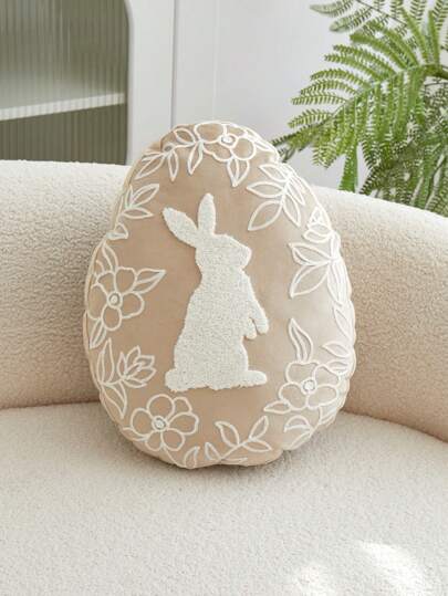 1pc Easter Beige Rabbit Embroidered Irregular Shaped Throw Pillow Cover, Spring Floral Pillow Sham, Easter Decorative Egg Shaped Cushion Cover, Suitable For Indoor Decor, Spring/Summer, Pillow Insert Not Included - Camel - View 1