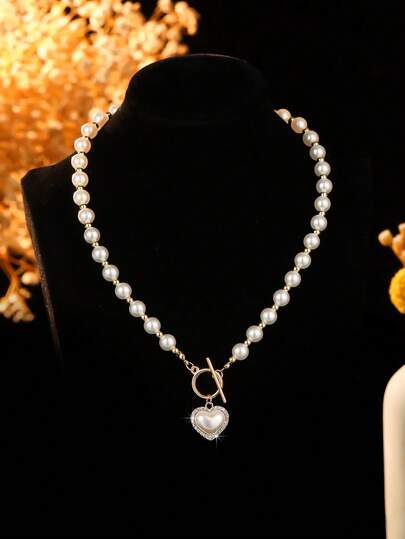 1pc Elegant Heart Shaped Pearl Necklace, Jewelry Gift For Couples, Brides, Weddings, Parties, Daily Wear, Fashionable High-End Accessory - Exquisite and Versatile Pearl Necklace - View 1