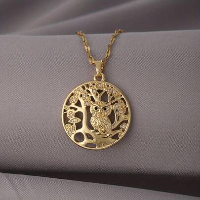 1pc Elegant Owl Tree Of Life Copper Pendant Necklace, Cubic Zirconia, Stainless Steel Chain, Summer Jewelry Gift For Girls And Women - Yellow Gold - View 1