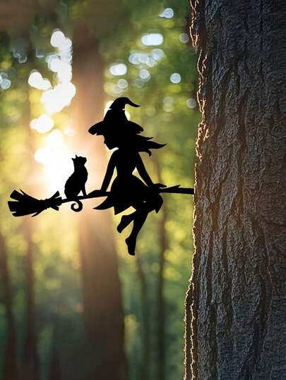1pc Enchanting Witch & Cat Garden Decor - Iron Yard Art With Flying Broomstick, Perfect For Halloween & Outdoor Spaces, Tree Stump Insert, Outdoor Garden Decor|Spooky Theme Decor|Iron Construction, Witch DecorA Perfect Halloween Gift For Lovers, Parents And Friends. - Multicolor - View 1