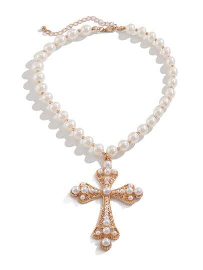 1pc Fashion Men's Faux Pearl Cross Necklace Layered Hip-Hop Style Bead Choker Necklace Accessory - A Beaded Necklace - View 1