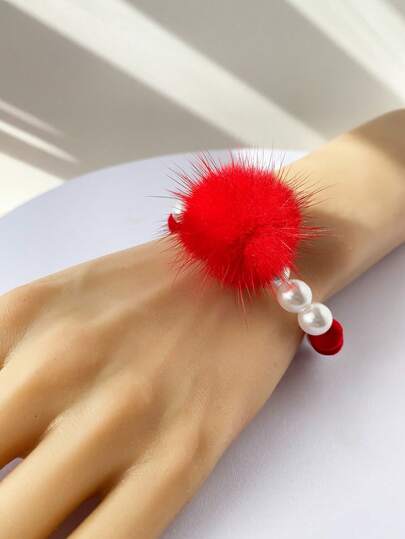 1pc Fashionable Christmas Fluffy Faux Pearl Beaded Bracelet, Elegant Charm Wrist Chain, Christmas Gift, Suitable For Daily Wear And Party - Red - View 6