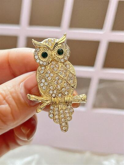 1pc Fashionable Crystal Inlaid Golden Cute Owl Brooch, Suitable For Daily Wear - Gold - View 1