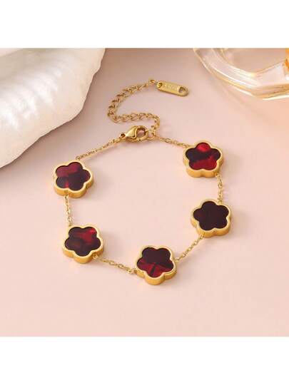1pc Fashionable Elegant Retro Versatile Floral Titanium Steel Lucky Five-Petal Flower Bracelet, Double-Sided Mother-Of-Pearl Clover 5-Leaf Stainless Steel Bracelet - Red - View 1