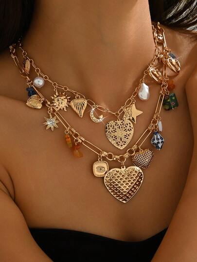 1pc Fashionable Gold Star & Moon Rhinestone Heart-Shaped Chinese Style Ceramic Flower, Glaze Stoned Pendant Necklace For Women, Suitable For Party, Street, Holiday Wear, Gift, Can Be Worn Layered, Available To Buy Individually - Multicolor - View 17