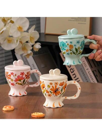 1pc, Floral Pattern Ceramic Mug, 320ml/10.8oz, Large Capacity, Portable, High-Quality Reusable Cup, Dishwasher & Hand Wash , Suitable For Hot & Cold Drinks, Birthday/Christmas Gift, Ideal For Home/Women/Office/Gifting/Couples - Multicolor - View 1