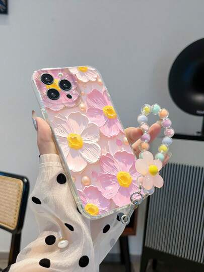1pc Transparent Anti-Drop TPU Floral Pattern Phone Case And 1pc Pink Flower Beaded Bracelet Compatible With Apple/Matching Phone Case/Phone Case With Lanyard/Wristband Phone Case/Fun Phone Case/Android Phone Case/ Phone Case/ Phone Case/OPPO Phone Case/Galaxy Waterproof Shockproof Scratch Resistant - Multicolor - View 1