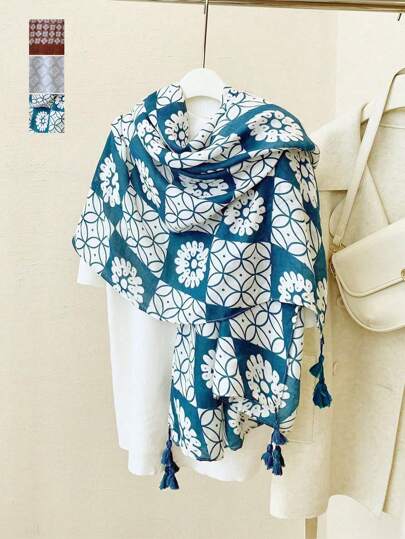 1pc Ditsy Floral & Plaid Pattern Fringe Scarf Shawl - View 1