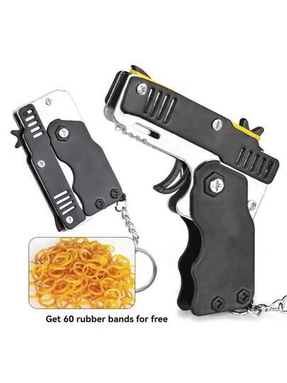 1pc Foldable Zinc Alloy Rubber Band Gun Model Keychain Shootout Gun With 60 Rubber Bands - Black - View 1