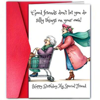 1 Thiệp chúc mừng sinh nhật hài hước "Rất vui vì chúng ta gặp nhau muộn" kèm phong bì đỏ, hình minh họa hai cụ bà đang cười, tấm thiệp sinh nhật hoàn hảo dành cho bạn thân.