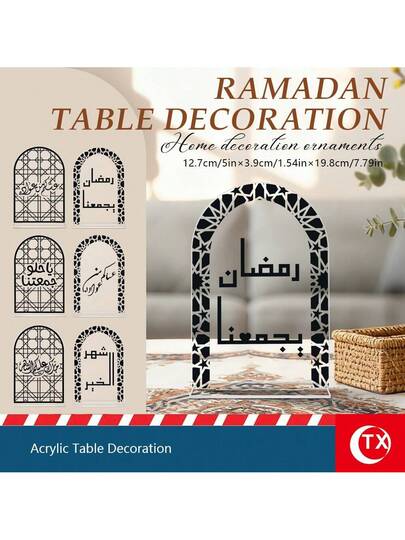 1 mảnh trang trí để bàn bằng acrylic rỗng hình học với các họa tiết thư pháp Ả Rập, có dòng chữ "Ramadan Kareem" và "May It Protect Us", thích hợp cho các buổi họp mặt gia đình trong tháng Ramadan, tiệc tùng ngày lễ, trang trí bàn ăn và làm quà tặng Eid Al-Fitr cho gia đình và bạn bè